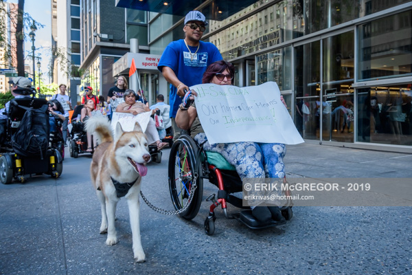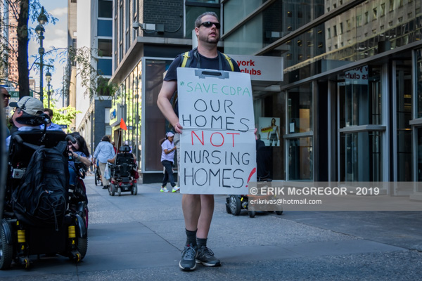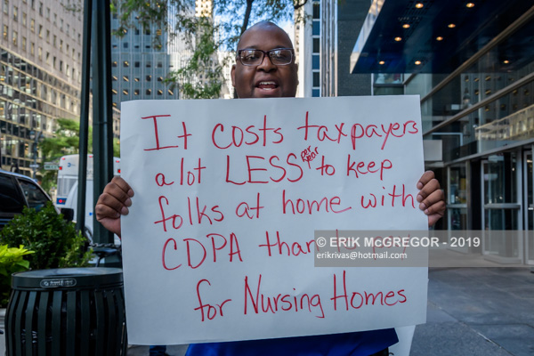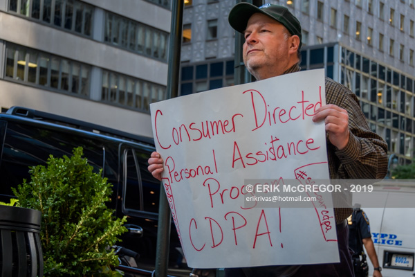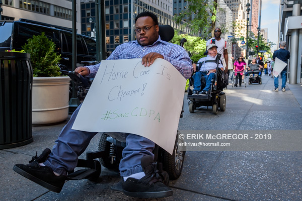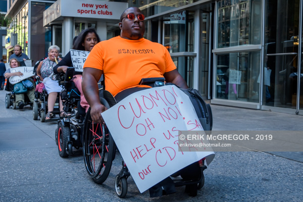 Image description: Various photos of protestors outside of Cuomo’s office in Manhattan during summer 2019, protesting the cuts to CDPA. There are people walking, in wheelchairs, with service dogs, and with scooters. Some of the signs being held say “CDPA gives me freedom,” “Disability Rights are Human Rights,” “Our Homes NOT Nursing Homes,” and “It’s 2019. We’re past Willowbrook.”